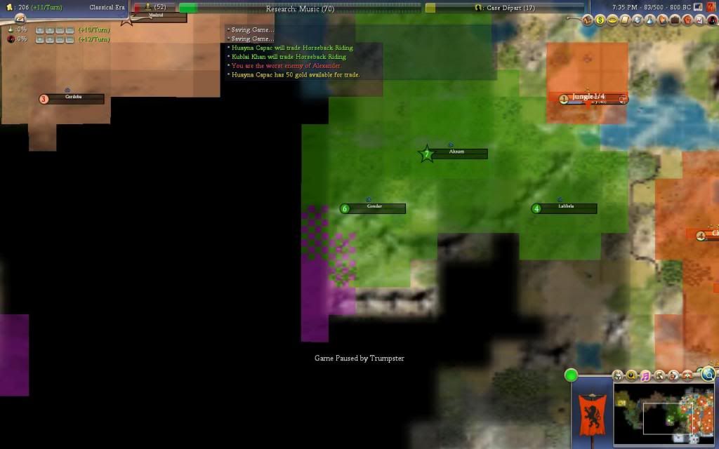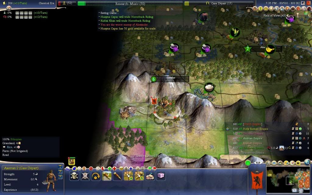 ) and it seems increasingly likely that we will want to build the Hanging Gardens at some point. We'd gain +10/11 pop in reasonably large cities. We can postpone the build until after we've generated the Education GSs, or before, to help with Caste specialists elsewhere.