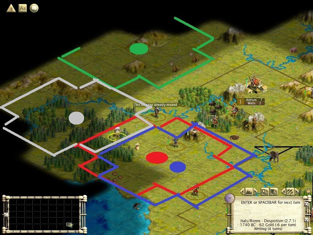 Veii is found by more furs. There still isn't a food bonus, but 2 cities have nice production. After monarchy, it becomes better when the forest can be mined.