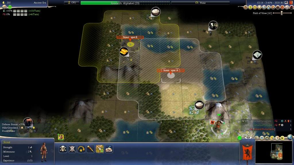 Scout: move 1 tile at a time to the Gold spot sector (the scout is crucial to fogbust the way for the Workers and Settler). Go to Gold and risk being suprised by a Bear/Lion on the other side of the hill (see spot B below) or play it safe and fogbust on flat land while waiting for the 1st Axe (see spot A below)?