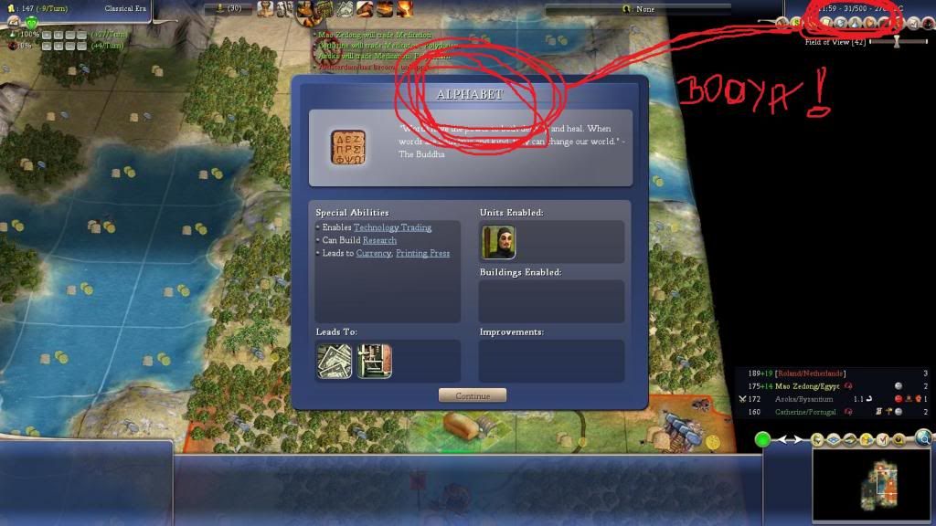 But in that case I'll do something better: settle city on T29 with 2 missing roads and an improved Gold on T30 (I had 1 spare movement turn for the Settler). This should land Alpha on T31 :cool: :cool: :cool: