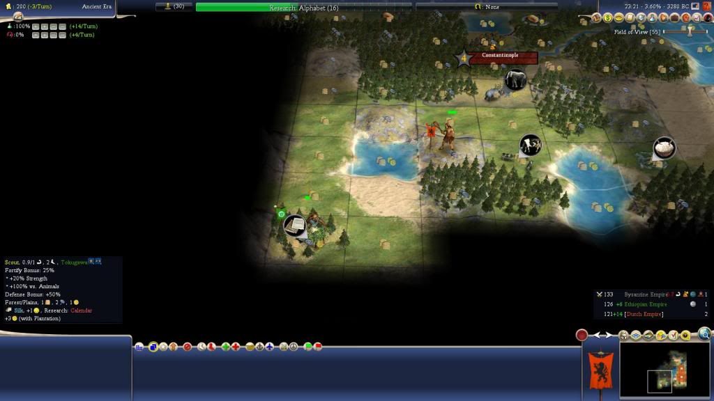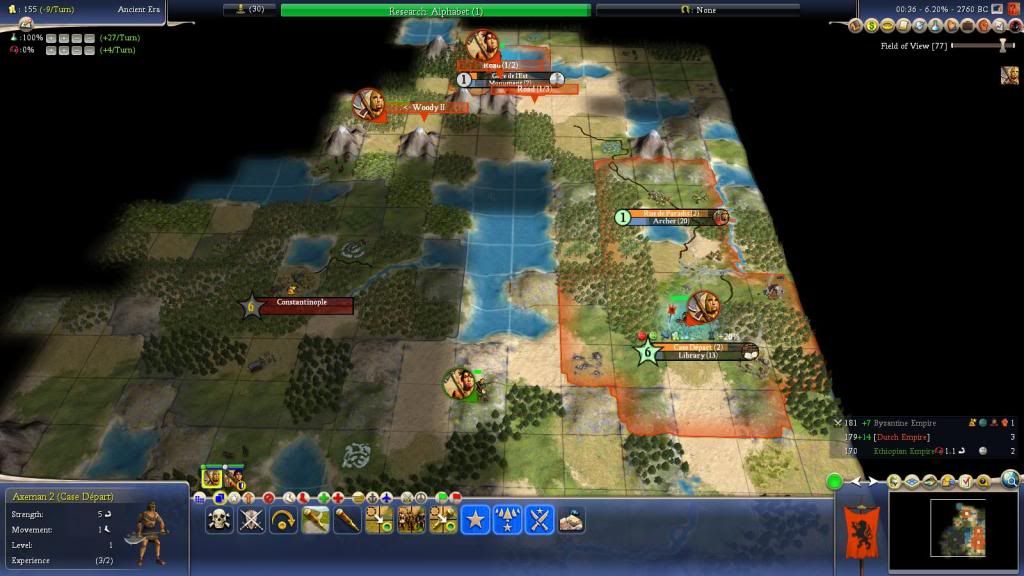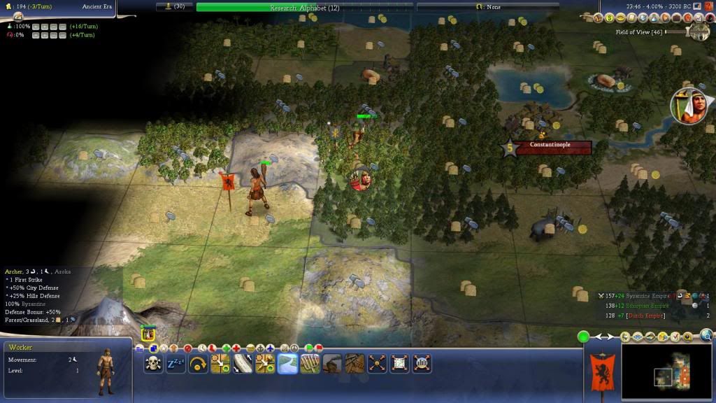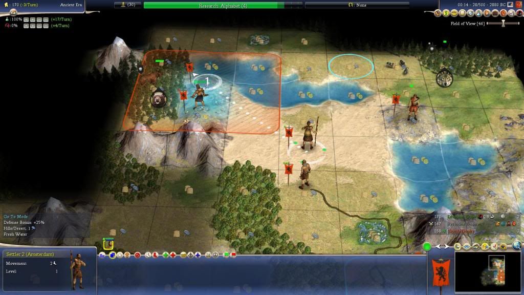 Turn 16, 3360 BC: You have trained a Settler in Amsterdam. Work has now begun on a Axeman.