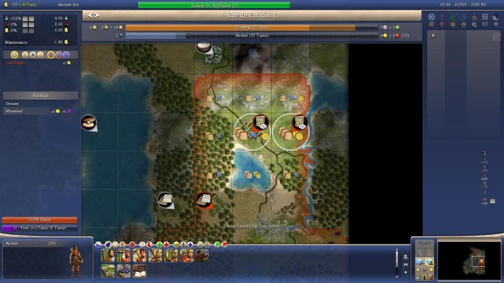 Turn 9, 3640 BC: You have constructed a Granary in Amsterdam. Work has now begun on a Settler.