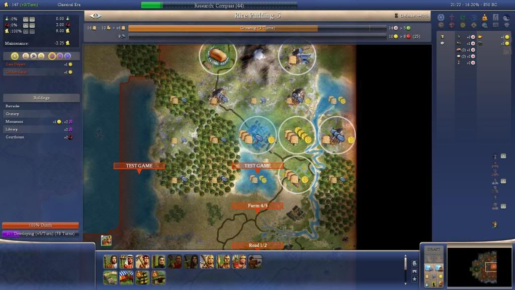 Chops should, of course, be delayed until the last moment possible if we still lack Mathematics. Either (a) improve other tiles before this, e.g. Cornish Cow should receive a Cottage 2N of the city; (b) pre-chop (2-turns) and then pre-Cottage/Farm the tile (3/4 turns), e.g. 1W of Golden Sands can be farmed for 4 turns. In some instances, you can also choose to (c) build a road. Roads are only worthwhile if they serve a purpose, e.g. 2W of Golden Sands could eventually connect Pigs/Wheat.