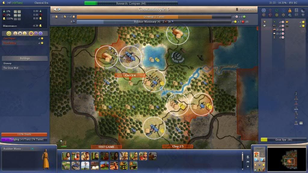 We want to steal either Construction and/or Calendar. Depending on how hard to trade Calendar, we might want it 1st. We could chop MoM in Constantinople or in Rice pudding. A bit early for spy now since we are still short of EPs. The spy could come from either Constantinople or nearby. We should consider it ~T80, we also want Toku's border city having Bud by that time. Hope you could see some free religion spread in your play.