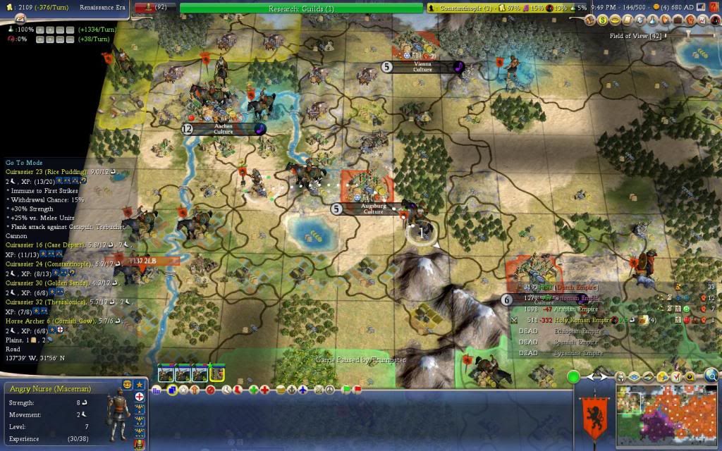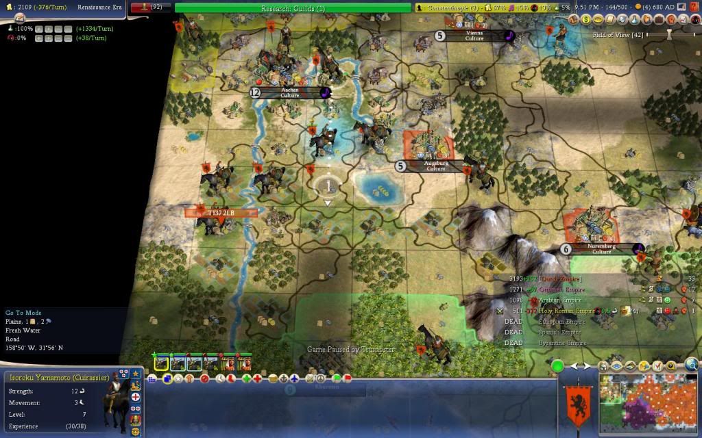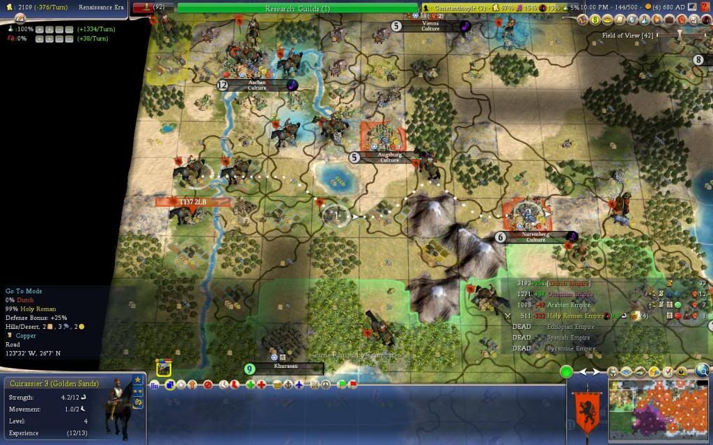 HC must be close to Guilds... does he still have a Scout by out southern Spice city? We could kill that for more war success. Are there any Workers we can capture.