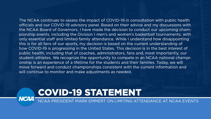 event cancellations are piling up in the U.S. and abroad. But the NCAA says it is not contemplating a postponement or cancellation of its lucrative marquee event.